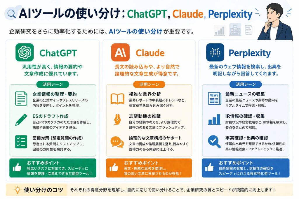 企業研究をさらに効率化するためには、AIツールの使い分けが重要です。