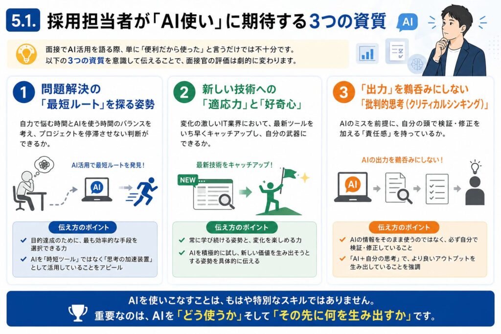 面接でAI活用を語る際、単に「便利だから使った」と言うだけでは不十分です。以下の3つの資質を意識して伝えることで、面接官の評価は劇的に変わります。